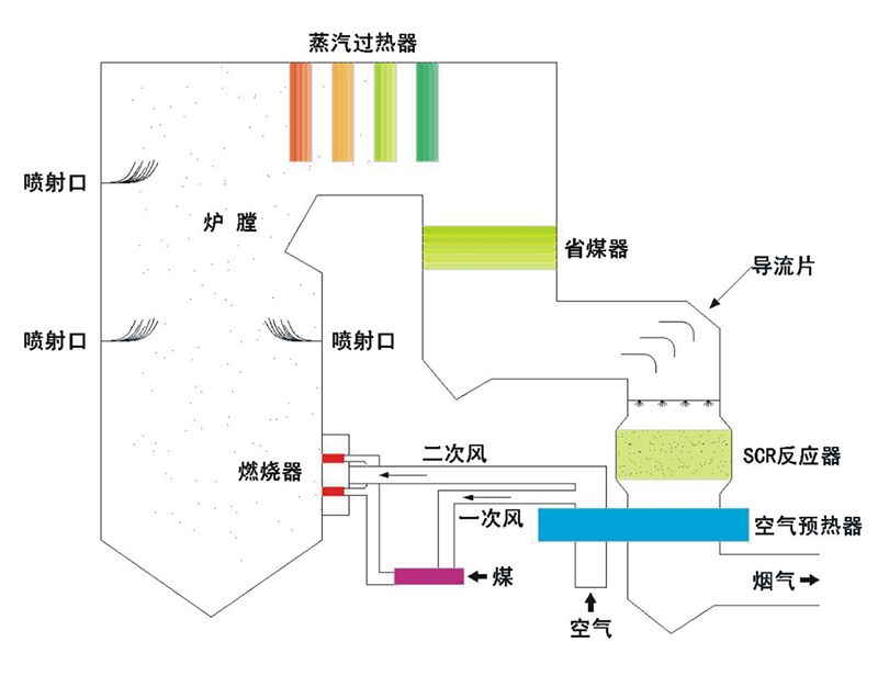 SNCR+SCR工藝是一種將SNCR與SCR有機(jī)組合起來的聯(lián)合脫硝工藝,即在850℃~1100℃的區(qū)域內(nèi)噴入還原劑,使煙氣中的NOx與還原劑進(jìn)行反應(yīng)實(shí)現(xiàn)NOx第一次脫除,來不及完全反應(yīng)的還原劑氨與NOx隨煙氣進(jìn)入裝有催化劑的SCR反應(yīng)器,在催化劑的作用下再次發(fā)生反應(yīng),實(shí)現(xiàn)NOx第二次脫除。整個系統(tǒng)包括還原劑儲運(yùn)、還原劑制備和供應(yīng)、計量分配、噴射、煙氣設(shè)備、SCR反應(yīng)器、電氣控制等子系統(tǒng)。脫硝效率可達(dá)90%以上。