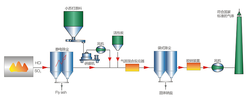 干法脫硫(SDS) 采用成熟的磨粉設(shè)備, 將碳酸氫鈉磨成粉粒在800目以上(直徑15um以下) 的細(xì)顆粒, 然后由噴射系統(tǒng)將碳酸氫鈉粉噴入SDS反應(yīng)器中, 與高溫?zé)煔饨佑|,NaHCO3快速熱分解,產(chǎn)生大量具有高活性和較大比表面的Na2CO3與SO2發(fā)生活化反應(yīng)。