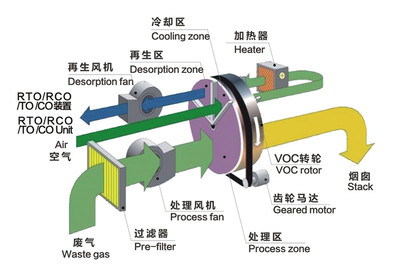 吸附濃縮處理技術是將吸附濃縮與氧化技術(包括R TO、RCO、CO) 組合在一起的VOCs治理技術。吸附濃縮以沸石分子篩或蜂窩活性炭作為吸附材料,以轉輪或固定床作為吸附裝置,將大風量、低濃度的VOCs廢氣轉化成小風量、中高濃度的廢氣。